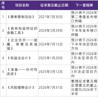 为便于读者了解IASB的最新动态,我们整理了IASB目前已经发布了征求意见稿但尚未修订完成的项目,具体如下: